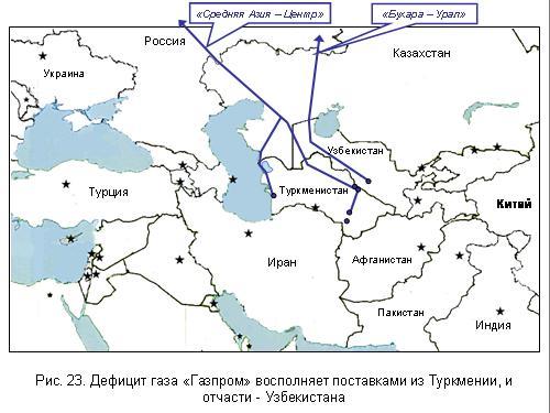 Во-первых, уже сейчас у "Газпрома" серьезный дефицит газа для одновременных поставок на внутренний рынок, а также в ближнее и дальнее зарубежье. И основную часть этого дефицита восполняет газ Туркмении и, отчасти, Узбекистана (рис. 23).