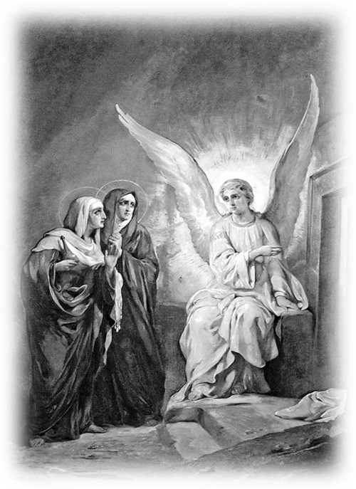 Жены-мироносицы, Мария Магдалина и Мария, мать Иакова, получают от ангела весть о Воскрешении Иисуса Христа