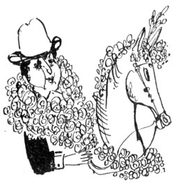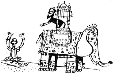 На обратном пути мы снова окунулись в буйный шум базара. И вдруг в самой толчее увидели свадьбу, точнее, приготовление к свадебной процессии. Верхом на гнедом коне, спокойно глядя поверх толпы, восседал жених. На нем была ковбойская широкополая шляпа, черный пиджак, белая рубаха. Он выглядел бы по-европейски, если бы на лбу не был нарисован красный кружок. Жених сидел прямой и неподвижный, стоически перенося тяжесть цветочных гирлянд, добрый десяток которых висел у него на шее. Конь был тоже убран цветами. И толпа мужчин в черном, приятелей жениха, и музыканты в оранжевой форме — все были в цветочных гирляндах.