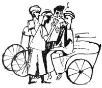 Тогда они отъезжали. На одном перекрестке компания велорикш играла в карты. На столбе было написано: «Велорикши. Сервис круглосуточно». Велорикши живут максимум тридцать три года. От непосильного труда начинается эмфизема легких, потом туберкулез.