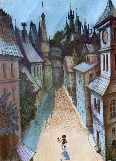 Люба вышла на безлюдную городскую площадь, прошла мимо старинной башни с часами и свернула в такой же безлюдный переулок. Она остановилась возле тускло освещённой витрины небольшой лавчонки. Это была мастерская игрушек. За стеклом стояли и лежали, висели на гвоздиках и сидели в разных позах всевозможные куклы: роскошные принцессы с удивлённо раскрытыми, немигающими голубыми глазами и ресницами неестественной длины; пастухи и пастушки в нарядных деревенских платьях; изящные танцовщицы в ярких шалях и с тамбуринами в руках; смуглые кавалеры в лакированных шляпах… Люба узнала и Красную Шапочку в окружении лесных гномов. Но больше всего её внимание привлёк солдат — деревянная кукла с крючковатым носом и тяжёлой челюстью, занимавшей половину лица. Казалось, куклу за какую-то провинность поставили в угол — самый дальний угол витрины. Покрытая пылью, она выглядела печальной и одинокой.