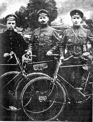 С ними, с этими знаниями и умением, он — «свободный художник», инженер, астроном, военный — вошел в революцию, встретив ее, как положено молодому передовому интеллигенту, с воодушевлением. Возможно, сыграла свою роль и альбигойская родословная. Кто на коне, а он — на велосипеде, т. е., по тем временам, на гребне технического прогресса — один из бравых офицеров Электротехнического батальона, разъезжающих по революционному Питеру, расцвеченному алыми флагами и лозунгами (рис. 4).