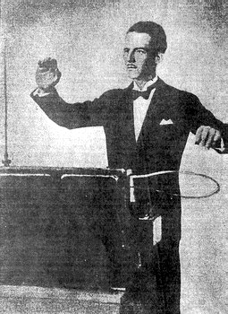 Идея использовать электричество в целях музыкального искусства была не новой. В одном экзотическом изобретении начала века — тогда еще не было электроники — предлагалось использовать «поющую» электрическую дугу. Термен сам, как вы уже знаете, в гимназическом своем детстве заставлял звучать подобным образом разряды на острие электрода, подсоединенного ко вторичной обмотке трансформатора Тесла. Большую, сенсационную известность получил инструмент американца Т.Кахилла (1897 г.). Это был набор электромашинных генераторов, каждый из которых возбуждал свою частоту. Их общий вес достигал 200 тонн, и они занимали целое здание. А звуки этот инструмент-монстр создавал... в наушниках телефонной сети Нью-Йорка. Набираешь номер скорой музыкальной помощи и слушаешь «Янки-дудль». Такое позволить себе могла только Америка! Были, конечно, проекты и более изящных по весу инструментов, но все они принадлежали парку динозавров.