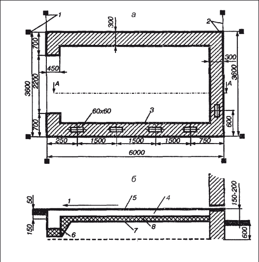 1 – деревянные колышки; 2 – разбивочный шнур; 3 – банкет; 4 – поверхность грунта; 5 – бетонный пол; 6 – порог ворот; 7 – изоляция; 8 – гравийная засыпка