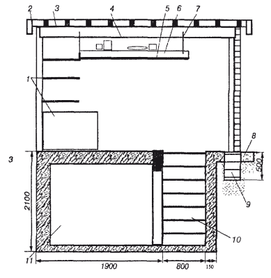 1 – верстак с тисками и стеллажи (полки): 2 – облицовочная доска; 3 – рубероид; 4 – балка перекрытия; 5 – балка навесного потолка (антресоли); 6 – щит антресоли: 7 – петли навески антресоли; 8 – отмостка; 9 – фундамент; 10 – смотровая яма; 11 – погреб (подвал)