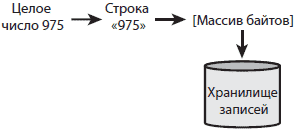 В этом примере рекорд хранится в переменной hiScore, которая сначала преобразуется в строку, для чего вызывается метод Integer.toString. Затем эта строка преобразуется в массив байтов методом getBytes. Все, что необходимо, – это одна строка кода, и целое число преобразовано в массив байтов. На рис. 19.2 представлена графическая иллюстрация этого процесса.