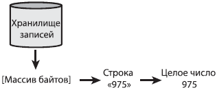 Конструктор String, используемый в этом коде, принимает массив байтов, смещение и число конвертируемых байтов. Переменная len, которая хранит число конвертируемых данных, содержит число, возвращенное методом getRecord, считывающим запись. Затем строка передается в статический метод Integer.parseInt, преобразующий строку в целое число. Рисунок 19.3 иллюстрирует процесс обратного конвертирования (массива байтов в целое число).