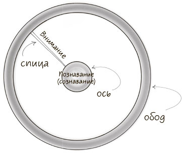 Колесо – это отличная метафора, чтобы показать, как работает наш разум. Идея пришла мне в голову во время работы в офисе, когда я обратил внимание на круглый вращающийся стол со столешницей из прозрачного стекла с деревянным обрамлением по краям. Я представил, что сознавание находится в центре стола (назовем его центром сознавания), а все то, на чем мы хотим сконцентрироваться, – мысли, образы, чувства или ощущения – по краям. Иными словами, все сознаваемое поместим на деревянный обод, а опыт, полученный в результате, – в оси колеса (центре сознавания).
