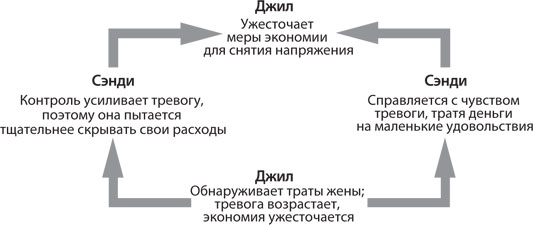 Эти различия зачастую становятся динамическими системами, порождая нисходящую спираль борьбы противоположностей, действий и противодействий. Сэнди и Джил ссорятся из-за денег. Сэнди считает Джила скрягой, Джил считает Сэнди транжирой. Когда Сэнди и Джил еще только поженились, эти разногласия вызывали лишь небольшие размолвки. Ситуация усугубилась, когда Джила уволили; тогда-то