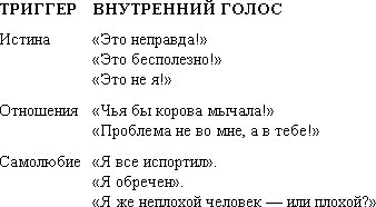 Настроившись на свой внутренний голос, замечайте определенные закономерности, стараясь понять, какой триггер вас заводит. Когда вы заведены, то думаете не о чем попало, а о достаточно конкретных и предсказуемых вещах. Понимание этого обстоятельства помогает справиться с действием триггера. Вариации бесчисленны, однако для каждого типа триггера (истины, отношений и самолюбия) характерна своя собственная тональность внутреннего голоса.