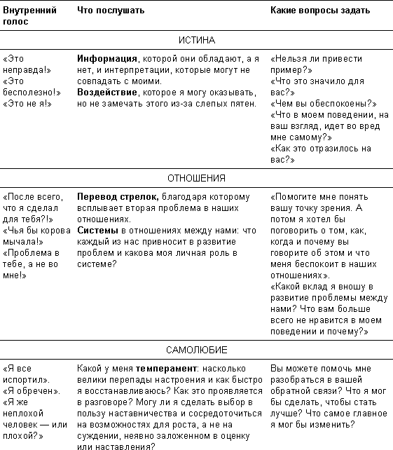 Подразумевается вот что: прежде чем начинать разговор по поводу обратной связи (если у вас есть время на подготовку), поговорите со своим внутренним голосом. Вам нужно согласовать с ним несколько вопросов. Не пытайтесь приструнить свой внутренний голос («Не уходи в оборону!») или заставить его замолчать («Можешь думать что угодно, но сиди тихо»). Как раз наоборот, внутренний голос становится громче тогда, когда ему требуется ваше внимание. Если вы уделяете ему внимание, он притихает. Поэтому настройтесь на то, что он говорит, и постарайтесь понять.