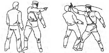 Несколько вариантов ударов рукояткой и стволом пистолета показаны на рисунках. Общее правило для них состоит в том, что пистолет надо держать стволом от себя, чтобы избежать случайного поражения самопроизвольным выстрелом. Держать пистолет за ствол можно лишь при том условии, что