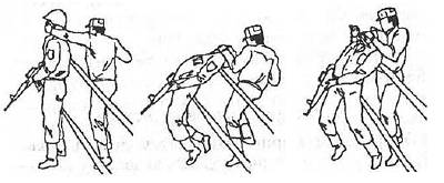 1. Подкравшись сзади на носках, разведчик зажимает часовому рот своей левой рукой и одновременно отжимает его голову и туловище назад. После этого он наносит удар ножом в шею, под левую лопатку, в печень (селезенку) либо перерезает часовому горло.