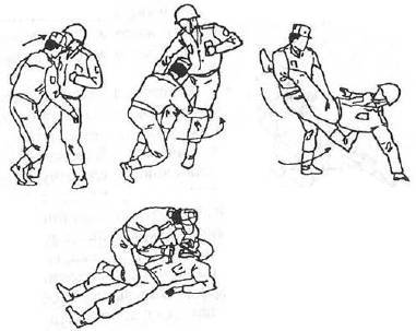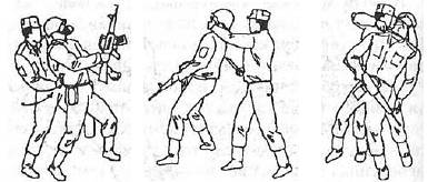 Например, можно ударить головой в лицо противнику (если на нем нет каски, о край которой можно рассечь свою собственную голову), тут же присесть и бросить его спиной на землю через захват руками под колени. Бросая, следует поднять ноги противника как можно выше, чтобы он ударился о землю затылком, затем добить его ударом ножа. Либо не добивать, а вставить в рот кляп, связать и унести. Но все же такие способы ненадежны, поскольку часовой, бдительно несущий службу, при появлении любого постороннего человека обязан сразу остановить его громким возгласом и навести на него оружие.