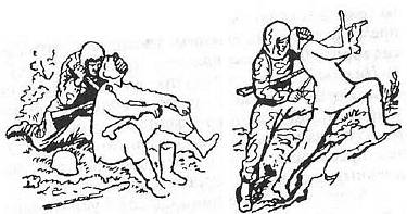 3. В тех редких случаях, когда разведчик приближается к часовому спереди, целесообразно сначала бросить противника на землю таким образом, чтобы он ударился головой о твердый предмет (чтобы не успел крикнуть), а затем добить ножом (рис. 51).