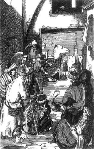 Откуда-то донеслось погромыхивание бубна. Там молодежь затеяла искрометные танцы, соревнуясь друг с другом в лихости. С другого края базара послышались напевные звуки сурная. Люди плотным кольцом обступили смуглого старого заклинателя змей, который дул в самодельную камышовую дудку, выводя грустную мелодию. Лохмотья едва прикрывали его выпирающие ребра. Из плетеной корзины показала голову очковая змея и стала медленно подниматься, раздув капюшон, раскачиваясь в такт мелодии…