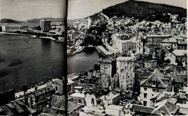 Если приближаться к Сплиту со стороны моря на пароходе, то взору предстанет общая панорама города, широко раскинувшегося на берегу большой гавани, утопающего в пышной зелени садов. Выделяются белые пятна старых домов, изящная колокольня, как бы парящая над сгрудившимися черепичными крышами, несколько современных высотных зданий, блестящих на солнце зеркальными стеклами больших оконных проемов и поражающих легкостью конструктивных форм.