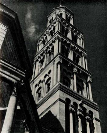 Колокольня непосредственно примыкает к Мавзолею; первый ее этаж имеет сквозной проход, соединяющий собор и перистиль- ный дворик. К сожалению, при строительстве колокольни был уничтожен прекрасный портик Мавзолея. Вход в колокольню фланкируется каменными фигурами лежащих львов. За ними, несколько выше, размещены скульптурные группы, высеченные в камне. Изображения святых Анастаса, Доима и Петра созданы в XIII веке мастером Отто, оставившим свою подпись. Неизвестному мастеру принадлежат скульптурные изображения хорватского и венгерского короля Белы IV и его жены Марии, содействовавших строительству колокольни.