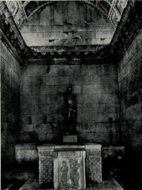 гладкими стенами. Обращает на себя внимание скульптурное оформление резного карниза, где можно увидеть ставшие впоследствии классическими все основные мотивы античного орнамента — овы, трилистники, пальметы, листья аканта, бусины. Зал перекрыт кессонированным коробовым сводом.В эпоху раннего средневековья храм был превращен в баптистерий- крещальню Иоанна Крестителя. Здесь был погребен один из первых ревностных организаторов сплитской христианской церкви, епископ Иоанн из Равенны (Иоанн Равенский), его саркофаг помещен у западной стены. Вот почему много веков спустя крупнейший скульптор Югославии XX века Иван Мештрович исполнил специально для этого храма бронзовую золоченую фигуру Иоанна Крестителя, она поставлена у стены, напротив входа.