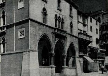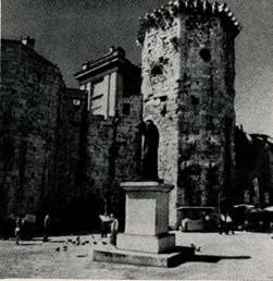 От дворца Камби можно пройти в небольшой проулок, который от Народной площади подходит к Железным воротам Дио- клетианова дворца. Здесь сразу же привлечет внимание высокое и узкое здание башенного типа. Оно относится к XIII веку. Его стены имеют лишь несколько полукруглых окон с двойными арочками. На западном фасаде в XVI веке были помещены огромные круглые солнечные часы. Здание завершает маленькая изящная на четырех колонках башенка (XV — начало XVI века) с колоколом. Напротив этого здания, к югу от ворот, расположено средневековое здание, на глухой западной стене которого находится небольшое рельефное изображение св. Антония с донатором, относящееся к концу XIV века.