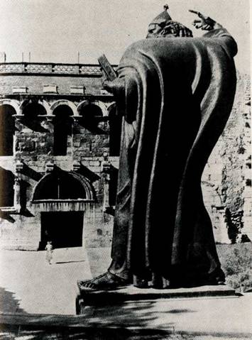 Средневековый Сплит рос главным образом в западном от дворца Диоклетиана направлении, куда переместился и центр города. В других местах вблизи дворца возникали единичные сооружения. Так, в XI–XIII веках около стен восточной и северной были возведены первые монастырские постройки. И сейчас можно еще увидеть недалеко от Золотых ворот, среди зелени расположенного здесь сада, развалины базиликальной трехнеф- ной церкви св. Бенедикта с капеллой, построенной Юрием Далматинцем в 1446 году. В капелле находился саркофаг его же работы с изображением сцены «Забрасывание св. Арнира камнями». В настоящее время он хранится в капелле Каштель-Лукшич вблизи Сплита. Церковь входила в ансамбль большого монастыря св. Бенедикта, основанного в XI столетии. В последующие века комплекс монастырских зданий разросся. В XIX столетии он был отдан под военный госпиталь и в конце того же века почти полностью сгорел.