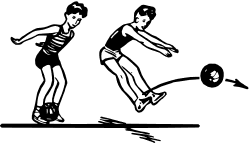 Участники одновременно или поочередно, резко наклоняясь вперед, бросают мяч через голову.