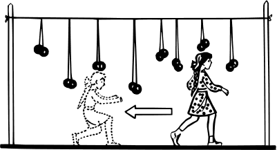 Участник, запомнив расположение мячей, должен пройти спиной вперед, не задев ни одного из них. Игроки имеют право двигаться только по прямой, приседая под мячами.