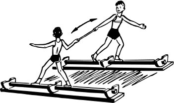 На рейки двух гимнастических скамеек, расположенных параллельно, становятся по одному участнику. Они держатся за противоположные концы гимнастической палки.