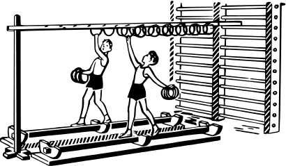 На шест или доску длиной 3—3,5 мс двух сторон набить гвозди. Расстояние между ними 20 см. Один конец шеста (доски) закреплен на рейке гимнастической стенки, другой — на прыжковой стойке. Высота зависит от роста учащихся. Слева и справа от шеста поставить гимнастические скамейки рейками вверх.