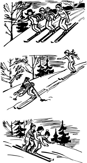 1. Спуск парами, тройками, взявшись за руки. Чья пара, тройка дальше прокатится?