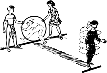 Гимнастический обруч, поставленный на пол, держат два помощника. Участник отмеряет от него 10 шагов, затем ему завязывают глаза и предлагают сделать 5—7 (нечетное количество) поворотов кругом. После этого игрок должен, отмерив 10 шагов, пролезть в обруч.