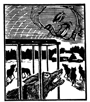 Попереду і з боків — грати. Рвонувся назад. Та було вже пізно. Залізні грати закрили прохід, відгородили його і зграю від лісу, свободи, життя… І тоді вожак завив, завив від люті, ненависті, безпорадності. Він викликав на поєдинок людину, яка навіть запах перетворила в пастку. Вожак ніби побачив людину — всемогутню, підступну, що розтягує рот і округлює щоки в посмішці так, як це вміє робити тільки вона.