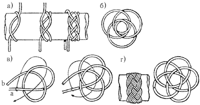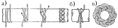 Плетение пятишлажного валькнопа легче всего разъяснить, если он изображен выполненным на предмете цилиндрической формы (рис. 92, а). Весь кноп изображен на передней стороне стеньги, на обратной стороне стеньги образуются прямые параллельные линии.