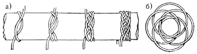 нечетное, начиная уже со второй части плетение идет над-под-над-под, сразу после этого пересекает первую часть. Затем плетут оставшиеся части аналогичным образом в противоположном направлении, образуя клетчатый рисунок валькнопа. Особое внимание следует обращать на плетение около гвоздей, чтобы плетение везде было правильным.Гвозди вынимают, когда плетение возвращается к исходному гвоздю. Валькноп увеличивают обычным способом, повторяя все части один, два или несколько раз. При необходимости валькноп можно покрыть шеллаком, промаслить или покрасить, чтобы придать ему необходимую жесткость. Если оплетаются релинги, перила трапа или нечто подобное из металла, то сначала наматывают вокруг релингов парусину и к ней прикрепляют ведущие булавки. Когда валькноп будет готов, парусину можно вынуть. Когда валькноп сядет, он плотно обтянет основу.