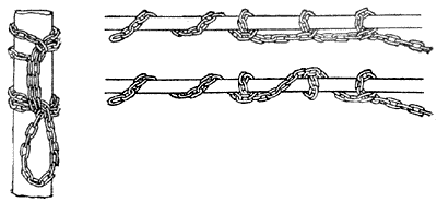 Строп из цепей привязывают, обносят вокруг предмета, а затем закрепляют шлагом (рис. 109), Цепной стопор можно обнести вокруг швартовного стального троса серией шлагов, которые не должны накладываться друг на друга, так как они могут стянуться. Для этого применяют обычные штыки, которые показаны на рис. 106. Штык, состоящий из одиночных шлагов, никогда не затягивается. Во все цепные стопоры должен быть вплетен короткий конец, отрезанный от бросательного линя, чтобы легче было вязать и фиксировать штыки.