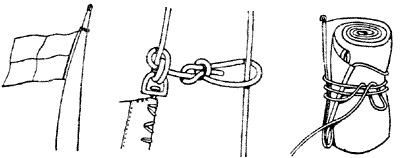 Флаги с металлическими вертлюгами привязывают рыбацким штыком (рис. 110) или штыком, показанным на рис. 51, а. Если они снабжены огоном из растительного волокна, то применяют шкотовый узел или штык, показанный на рис. 65. Когда поднимают все флаги расцвечивания для парадного украшения судна, верхние флаги часто обвиваются вокруг фалов. Этого можно избежать, если при привязывании верхнего флага на фале оставить короткий кончик, закрепляемый беседочным узлом к ходовому концу флаглиня, по которому беседочный узел может перемещаться. Вместо беседочного узла можно использовать небольшую струбцину, причем флаглинь должен свободно проходить через дугу струбцины. Флаги складывают так, чтобы видна была маркировка и темные цвета были снаружи. Сложенные флаги скрепляют скользящим штыком, который можно легко развязать. Лучше всего флаги поднимать сложенными и расправлять после того, как они достигнут топа мачты. Государственные флаги всегда поднимают развернутыми.