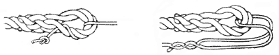 Существуют еще другие способы выполнения огона на четырехпрядном тросе. Один из них заключается в том, что четвертую прядь пробивают под одну прядь против спуска. Другой из способов состоит в том, что две средние пряди пробивают крестообразно под одну и ту же прядь, причем первая прядь находится наверху, а затем пробивают другие две каждую под свою прядь, а левую – налево. Но метод, показанный на рис. 122, считается лучшим.