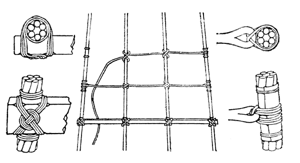 Огоны на тонких линях толщиной 4,4 см и меньше выполняют только двумя полными пробивками каждой нити, а затем, особенно на тонких расти тельных тросах, выполняют три или четыре пробивки прядями, из которых вырезано большее или меньшее число нитей. Чтобы плетение имело более опрятный внешний вид, его можно оттренцевать. Для этого после первой пробивки из каждой пряди выводят по три нити и сплесень выполняют обычным способом, но уменьшенными прядями. Нити затем свивают по три в плотные ровные юзени, которыми и накладывают трени прочно и надежно. Затем концы нитей пробивают под свои пряди (а лучше пробивать с помощью парусной иглы под одну ив середину одной пряди или в середину двух прядей), после этого нити обрезают (рис. 120, д).