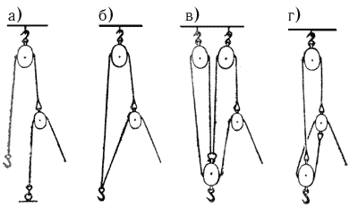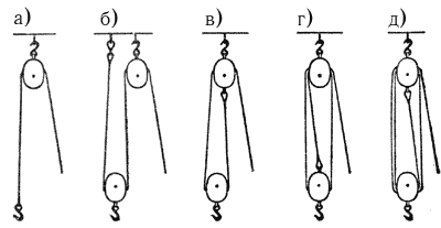 В зависимости от числа шкивов в блоках, через которые проходят лопари, различают (рис. 7): а – простой гордень, проходящий через неподвижный блок; б – двойной гордень, проходящий через неподвижный и подвижный блоки; в – простые или двухшкивные тали; г – двойные или трехшкивные тали; д – четырехшкивные тали.