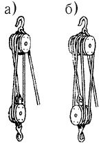 Большие тали называются гинями или полиспастами. Они имеют пять, шесть и более шкивов и предназначены для подъема тяжелых грузов. На рис. 9, б показаны гини с двух- и трехшкивными блоками. Тали дают различный выигрыш в силе в зависимости от их конструкции. Обычные простые тали дают, например, двойной и тройной выигрыш прилагаемого усилия. Если тали устроены так, как показано на рис. 7, а, то они дадут двойной выигрыш в силе, но если груз крепить к верхнему блоку, то выигрыш в силе утроится.