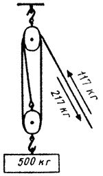 Пример 1 (рис. 10). С помощью трехшкивных талей требуется поднять груз весом 500 кг. Лопарь проходит через три шкива, сила трения на каждом составляет 10% веса. В сумме это дает силу трения, соответствующую 150 кг, что прибавляют к весу нетто (чистому весу). Весь груз теперь имеет вес, равный 650 кг. Груз распределяется на три части шкива, следовательно, 650 кг делят на три, что дает приблизительно 217 кг. Вычисления записывают следующим образом: (500 + 3*0,1*500): 3 = = 217 кг.