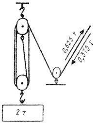 Пример 2 (рис. 11). С помощью четырехшкивных талей со шкивами высокого качества и лопарем, проходящим через ведущий блок, в общей сложности пяти шкивов, требуется поднять груз весом 2 т. Здесь трение составляет 5% веса груза на каждый шкив и становится равным 5*0,05*2 = 0,5, а весь груз – 2,5 т. Нагрузка делится на четыре части. 2,5 т делим на 4, получаем 0,625 т = 625 кг. Вычисления записываются следующим образом: (2 + 5*0,05*2): 4 = 0,625 т.
