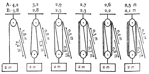 На рис. 12 показаны силы трения. Цифры, написанные вдоль лопаря, показывают преодолеваемые силы трения при подъеме и опускании груза. Величина А показывает силу на блоке при подъеме, величина В – при опускании груза. Из приведенных данных ясно, что больший выигрыш при подъеме получается, если лопари проходят через большее число шкивов. Данные приведены без учета веса самих талей. Системы блоков, лопари и стропы имеют значительный вес, которые в действительности следует прибавлять к величинам А и В.