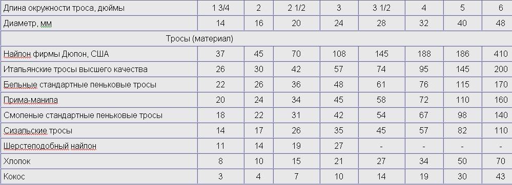 Прочность троса зависит от сорта материала и его качества и колеблется в больших пределах. Так, нагрузка, возможная в одном случае, в другом оказывается слишком большой. Опыт показывает, что тонкие тросы в отличие от толстых имеют прочность, равномерную по всей длине. Причина в том, что чем толще трос, тем сложнее равномерно распределить нагрузку на все его пряди. Это наглядно показано в табл. 1 и 2, которые составлены для тросов с различной прочностью. Для синтетических тросов рекомендуется придерживаться данных, содержащихся в таблицах прочности для каждого конкретного материала. Такие таблицы составляются изготовителями. Важное значение имеют правильное хранение и уход за тросом. Изношенные, потертые, чем-либо поврежденные тросы теряют первоначальную прочность. Таблицы показывают приблизительную разрывную прочность для трехпрядного троса.