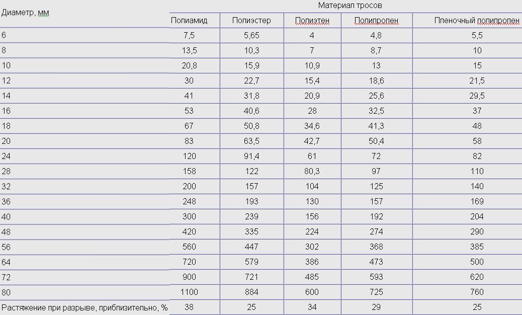 Таблица 2. Разрывная нагрузка для синтетических тросов (согласно стандартам Великобритании), кН.