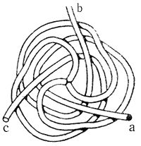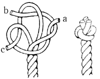 Двойной кноп "голова змеи" (рис. 74). Заделывается так же, как и двойной талрепный кноп, но каждую прядь обводят вокруг всего троса и пропускают в петлю, образованную каждой прядью соответственно. Прядь а проводят под прядями b, с и а и выводят между прядями а и b. Пряди b и с проходят так же. Затем пряди кнопа обтягивают.