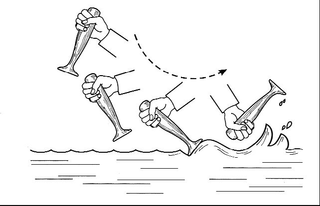Сидя на корме лодки, рыболов погружает копытце или пятак квока в воду со скоростью удара, рассчитанного на то, чтобы прорвать натянутый лист газетной бумаги. Погрузив копытце на 5–8 см косым ударом спереди – назад, его извлекают из воды, сохраняя прежнее направление движения и скорость. Вначале у рыболова получается очень много брызг.
