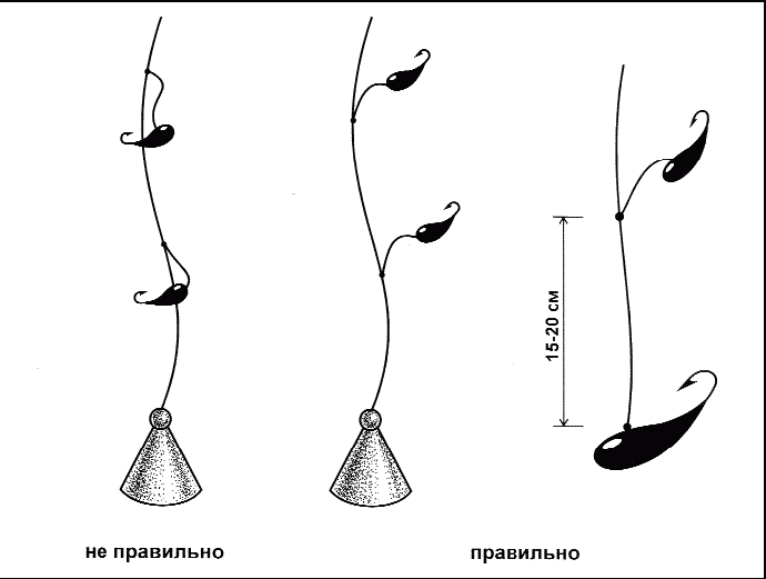 Первый поводок подвязывают в 10–15 см выше грузила, второй еще на 15–20 см выше.