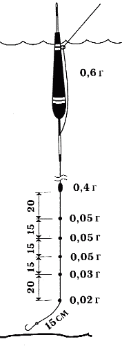 Если интересующая нас рыба держится вблизи дна (на глубине 3 м), то огрузка оснастки составляется с таким расчетом, чтобы верхние слои воды она проходила быстро, не успев заинтересовать мелкую рыбу, держащуюся у поверхности. С этой целью в грузиле – «оливке» сконцентрировано до 95% всего веса оснастки. Равномерно распределенная