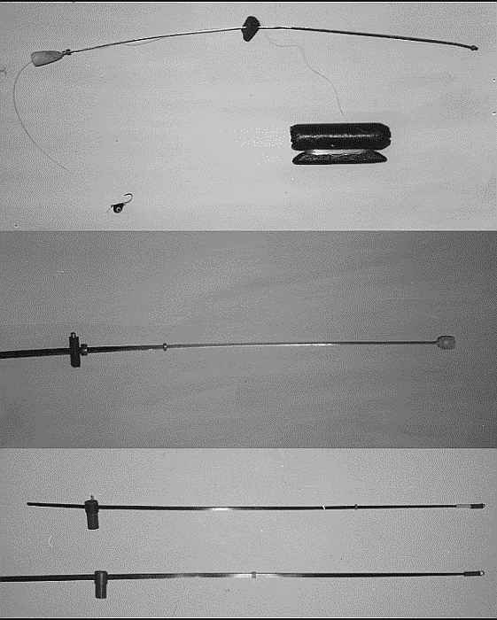 Снасть представляет собой легкое удилище длиной 4–6 м, на вершинке которого крепится удлиненный боковой кивок с ярким маячком на конце. Леска наматывается либо на безынерционную катушку и пропускается через кольца, либо крепится на верхнем колене на мотовильце (можно использовать мотовильце любой конструкции). Применение катушки и пропуск лески через кольца удилища допускается только при ловле с лодки или в идеальных условиях (отсутствие тростника и кустарника) с берега. Надо сказать сразу, что такие условия на рыбалке встречаются редко. Обычно рыболов с трудом протаскивает свою снасть сквозь дебри береговой растительности. Если же леска проходит через все удилище, сделать это гораздо труднее. Да и подматывать ее сквозь устройство бокового кивка обычной конструкции весьма затруднительно.